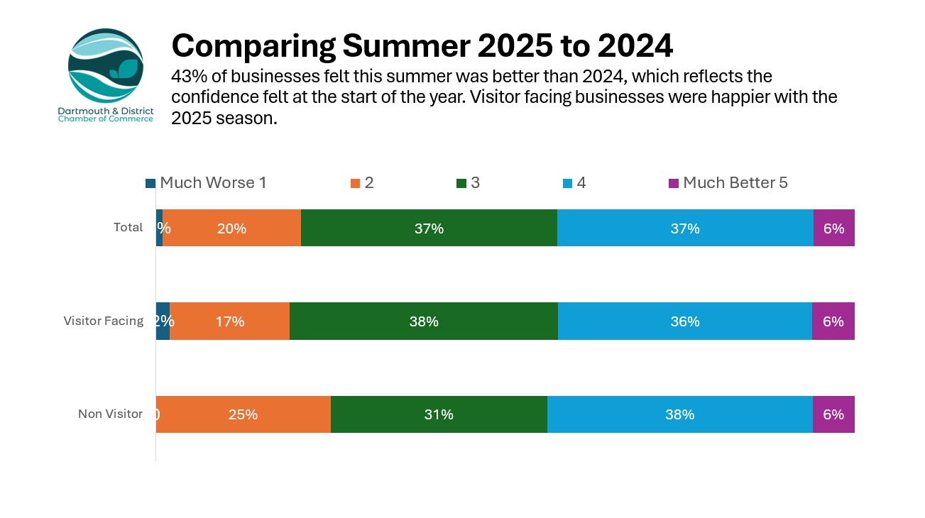 Whilst the business climate is tough in the UK, the fact that 43% of Dartmouth businesses felt the summer was an improvement on 2024 should be seen as encouraging. There continue to be key areas on which businesses would like to see positive change, and these results help inform and guide both the Chamber of Commerce, and the tourism team at Explore Dartmouth.