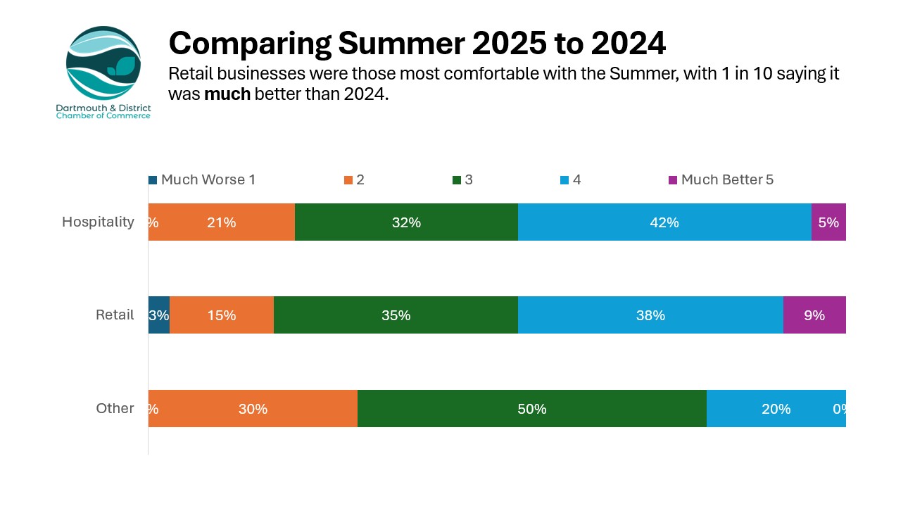 As this first chart shows, the majority of businesses felt Summer 2025 was at least as good as the previous year, if not better. Given the tough business climate this is a good outcome for Dartmouth, whilst also reflecting that times are tough, and significant year on year growth in business is not a given.