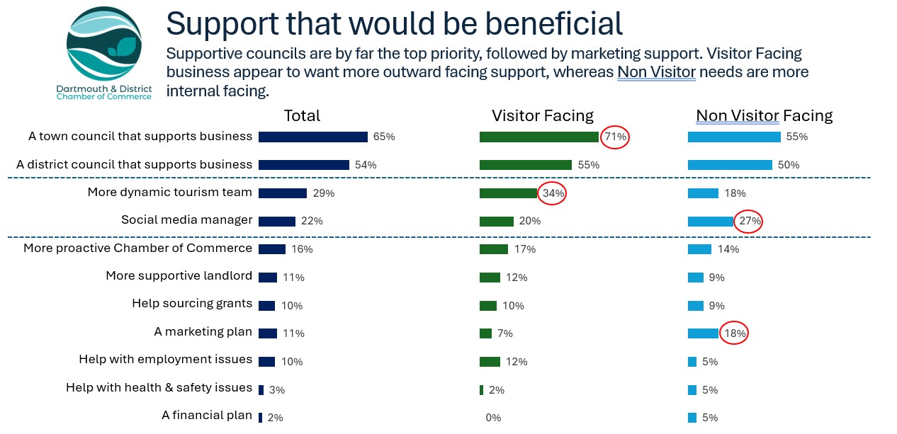 More support from Town & District Councils continues to be a key concern for businesses, followed by support with marketing. In addition to the higlighted differences between Visitor Facing and Non-Visitor Facing business responses, retailers were particularly interested in support with marketing. This could be a result of Dartmouth retailers often being small, independents by nature, whereas hospitality includes a number of larger organisations which have marketing capabilities in-house.