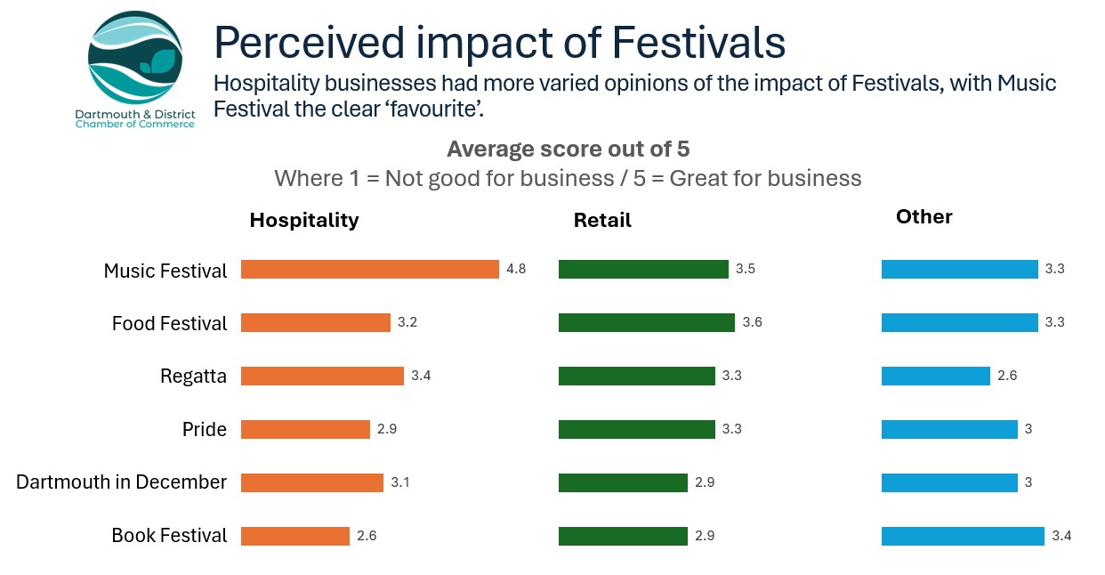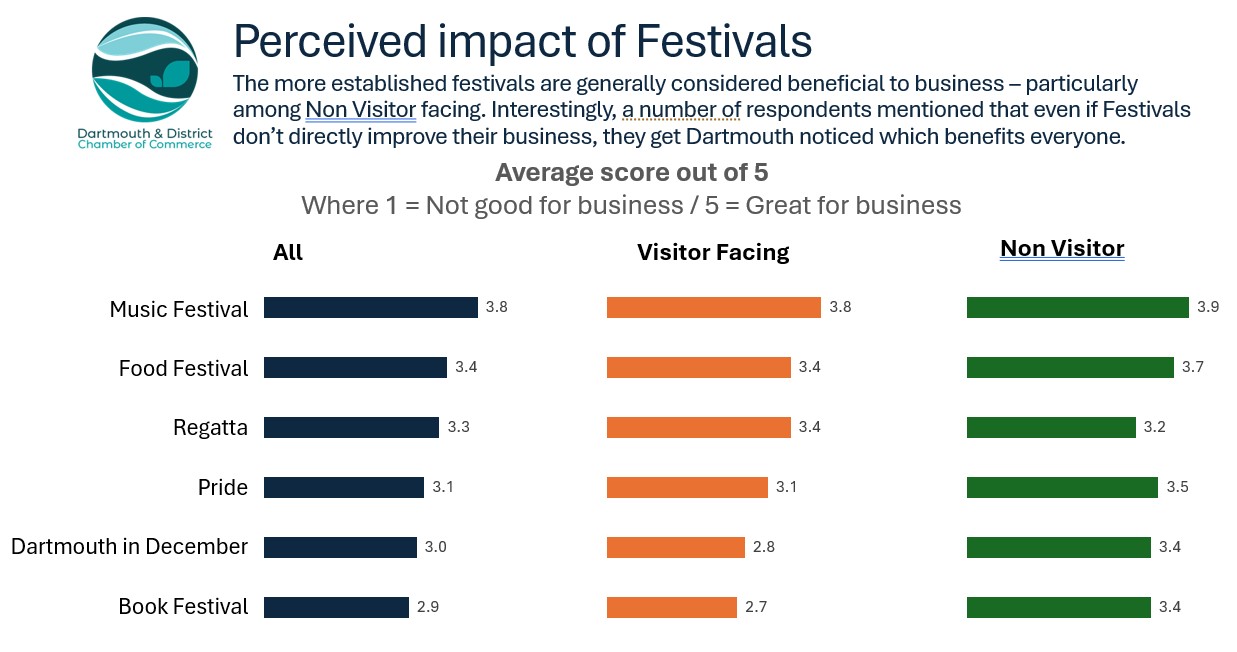 Festivals are recognised as an important part of raising the profile of Dartmouth as a place to visit, although their different features and appeal are reflected in the varying impacts on businesses. Further analysis will be carried out to understand the different responses in more detail, and shared with the various committees / organisers to help with their future plans.