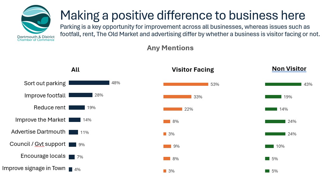 Parking has long been an issue for Dartmouth, and Jo (Chair of Chamber) continues to advocate for the businesses on the issue of parking on a regular basis. There is no quick fix, but the survey responses provide yet more evidence of the impact on business. Footfall is a key concern for Explore Dartmouth as they pull together a clear marketing plan for Dartmouth 2026 – with a priority being getting the right visitors here, who are willing to engage in everything Dartmouth has to offer, and spend while they are here!